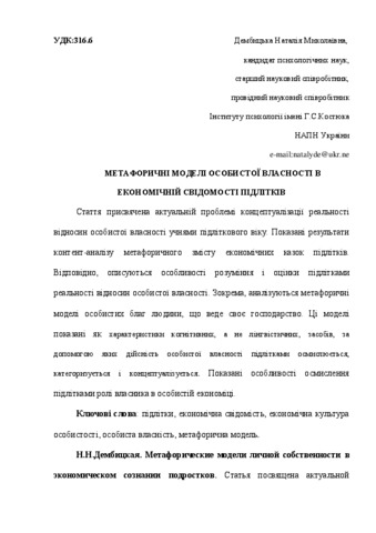 - Дембицька, Н.М. (2015) Мetaphorical models of personal property in economic consciousness of teenagers Психологічний часопис: збірник наукових праць, 2. pp. 36-41. ISSN 978-966-189-358-9