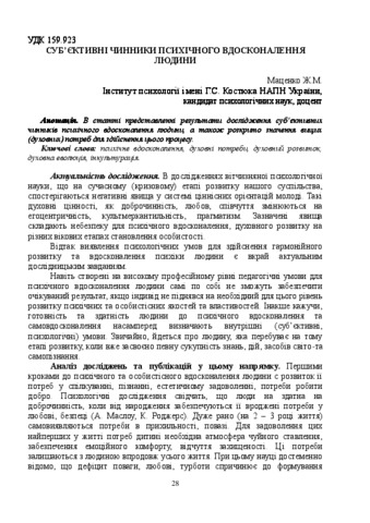 - Маценко, Ж.М. (2015) Subjective factors of psychological improvement of a person Актуальні проблеми психології: Збірник наукових праць Ін-ту психології НАПН України. Т. 9. Випуск 6. pp. 28-36. ISSN 2072-4772