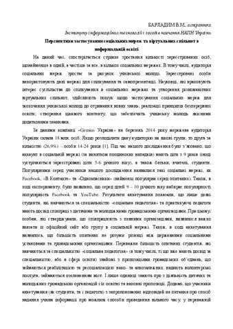 - Барладим, В.М. (2015) Prospects of social networks and virtual communities in non-formal education In: ІІ Всеукраїнська Інтернет-конференція "Теоретичні та прикладні аспекти використання математичних методів та інформаційних технологій у науці, освіті, економіці та виробництві" . Маріупольський державний університет, м.Маріуполь, Україна, pp. 6-9.
