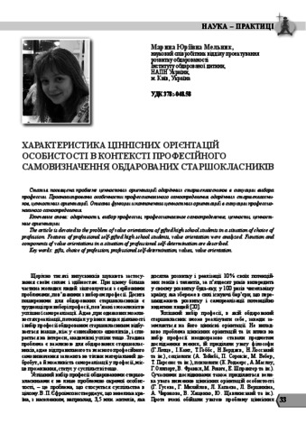 - Мельник, Марина Юріївна (2013) Characteristics of valuable orientations of personality in the context of professional self-determination gifted high school students Education and Development of Gifted personality, 8-9 (15-16). pp. 33-37. ISSN 2309-3935