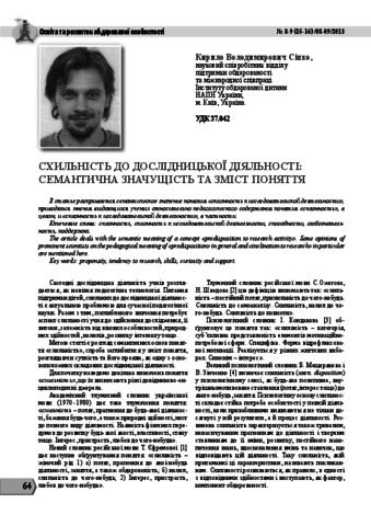 - Сіпко, Кирило Володимирович (2013) Students` disposition towards research activity. Semantic meaning and the concept matter Education and Development of Gifted personality, 8-9 (15-16). pp. 64-66. ISSN 2309-3935