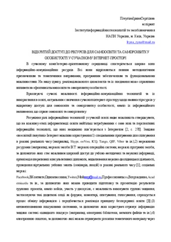 - Пічугіна, І.С. (orcid.org/0000-0001-6460-8507) (2015) Open access to resources for self-education and self-development in the modern Internet space In: Звітна наукова конференція Інституту інформаційних технологій та засобів навчання . ІІТЗН НАПН України, м.Київ, Україна.
