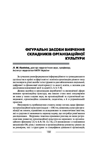 - Калініна, Л.М. (2015) Figurative facilities of study of components of organizational culture In: Modern progress of organizational culture of general educational establishment trends are in informative society, 10.04.2014, м.Київ, Україна.
