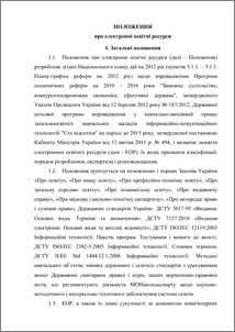 У проекті положення уточнено місце та роль електронних освітніх ресурсів у складі освітнього середовища. Уточнено зміст основних понять, представлено класифікацію ЕОР та визначено основні вимоги до цих інформаційних ресурсів, їх розробки, експертизи та поширення. Даний проект може сприяти розробленню методології створення ЕОР, їх ефективному використанню в освітній практиці.