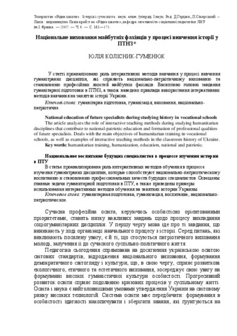 - Колісник-Гуменюк, Юлія Ігорівна (2007) National education of future specialists during studying history in vocational schools Society "Native School": History and Present: Research Almanac (4). pp. 161-171. ISSN ISBN 966-613-236-2