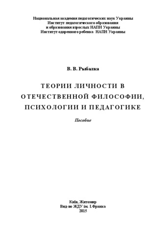 Рибалка, В.В. (2015) Theories of personality in domestic philosophy, psychology and pedagogics . ЖДУ ім.І.Франка, м.Житомир, Україна. ISBN 978-966-485-194-4