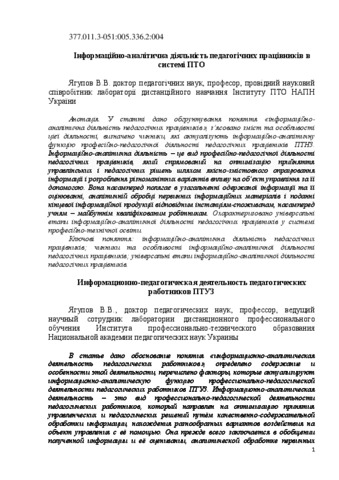 - Ягупов, Василь Васильович (2015) Informational and Analytical Activity of the Pedagogical Workers in the System of the Professional Technical Education Проблеми освіти (82). pp. 298-304.