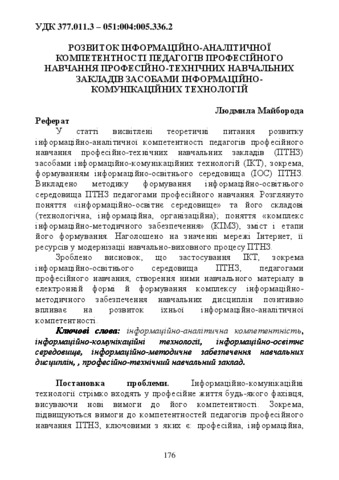 - Майборода, Людмила Анатоліївна (2014) Development of information and analytical competence teachers of vocational training vet information and communication technologies Модернізація професійної освіти і навчання: проблеми, пошуки та перспективи, 5. pp. 176-187.