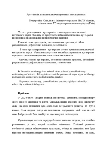 | Keywords: | art-therapy, postnonclassical practice, sigiziyna rationality, reflexivity relations, totallogenez. |