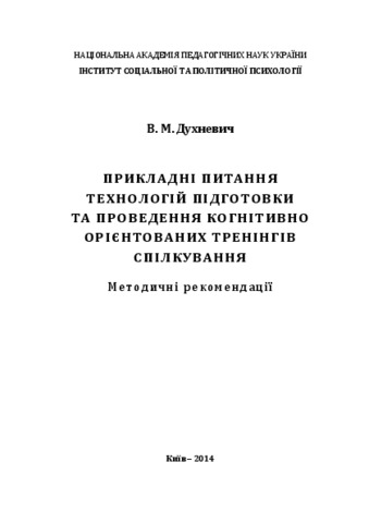 Guidelines for the preparation and conduct cognitively oriented communication training developed within the research theme "Theoretical and methodological principles and applied cognitive psychology of communication capacity," which applied laboratory of communication problems of the Institute of Social and Political Psychology of NAPS. The recommendations defined specificity and nature of cognitive communication in accordance with the methodological principles of cognitive oriented training of communication. Justification-convertible principles of designing such training offered author approach to the development of the training program, described the associated social and psychological effects. For teachers and university students in the fields social related profiles (psychologists, teachers, sociologists, political scientists, social workers). It also can be used by institutions, which are aimed at optimizing processes co-understanding.