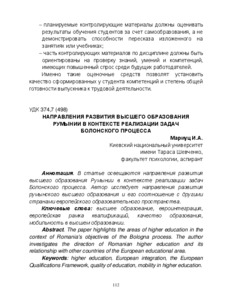 The paper highlights the areas of higher education in the context of Romania's objectives of the Bologna process. Author investigates direction of Romanian higher education and its relationship with other countries of the European educational area.