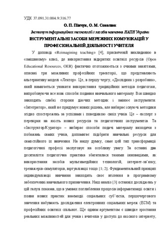 - Пінчук, О.П. and Соколюк, О.М. (2015) Tools of network communications in professional work of the teacher In: Збірник наукових праць «Дидактика фізики як концептуальна основа формування компетентнісних і світоглядних якостей майбутнього фахівця фізико-технологічного профілю» . Кам’янець-Подільський національний університет імені Івана Огієнка, м.Кам’янець-Подільський, Україна, pp. 143-145.