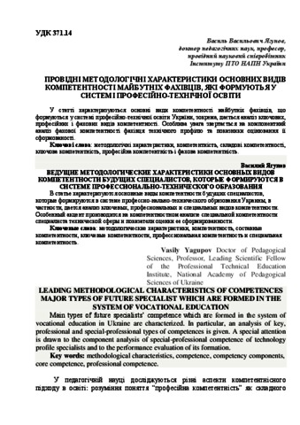 - Ягупов, Василь Васильович (2012) Leading methodological characteristics of competences major types of future specialist which are formed in the system of vocational education Модернізація професійної освіти і навчання, 2. pp. 45-59.
