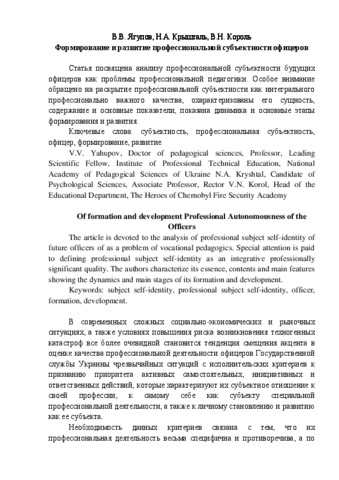 - Ягупов, Василь Васильович, Король, Василь Миколайович and Кришталь, Микола Андрійович (2013) Of formation and development Professional Autonomousness of the Officers Известия Российской академии образования, 1. pp. 74-83.