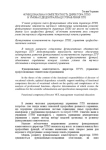 In the theses of the content of the functional responsibilities of director of vocational schools, updated dependence scientific support modeling of functional competence director of vocational schools on the quality and completeness of its analysis of professional functions, objective determination of which creates the conditions for the scientific substantiation and specification management concepts.