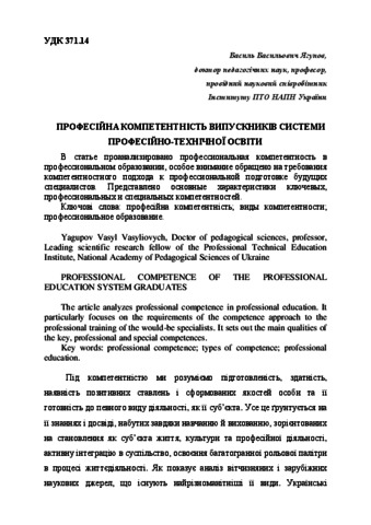 - Ягупов, Василь Васильович (2011) Professional competence of the professional education system graduates In: Система роботи ПТНЗ з формування професійно мобільного кваліфікованого робітника: матеріали Всеукр. наук.-практ. конф., 23-24 листопада 2011 р., Кривий Ріг . Криворізький міський методичний центр профтехосвіти, м.Кривий Ріг, Україна, pp. 9-11.