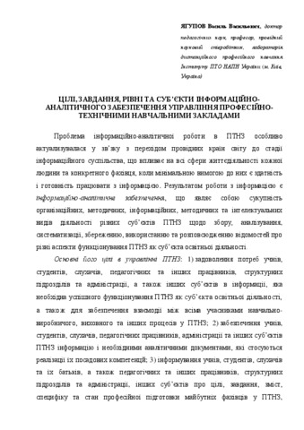 - Ягупов, Василь Васильович (2015) Aims, tasks, levels and actors of informational and analytical support for the management of professional technical educational establishments In: Розвиток сучасної освіти: теорія, практика, інновації: зб. матеріалів міжнародної науково-практичній конференції, м. Київ, 14-16 травня 2015 р. . Національний університет біоресурсів і природокористування України, м.Київ, Україна, pp. 182-185.