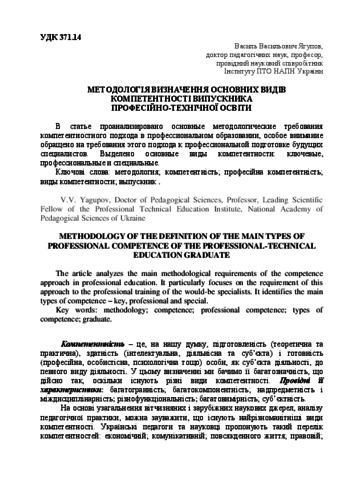 - Ягупов, Василь Васильович (2011) Methodology of the definition of the main types of professional competence of the professional-technical education graduate Освітньо-наукове забезпечення діяльності правоохоронних органів і військових формувань України. pp. 373-376.