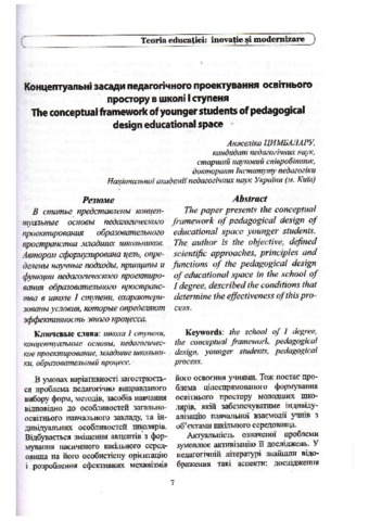 - Цимбалару, Анжеліка Дмитрівна (2013) Conceptual bases of pedagogical designing educational environment at school I level Univers pedagogiс, 1 (37). pp. 3-6. ISSN 1811-5470