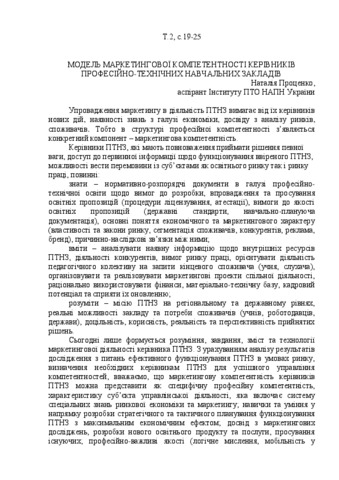 - Проценко, Наталія (2015) Marketing managers competency model vocational schools In: Науково-методичне забезпечення професійної освіти і навчання: матеріали звітної науково-практичної конференції за 2014 рік (м. Київ, 26 березня 2015 р.) , 1 (2). ІПТО НАПН України, м. Київ, Україна, pp. 19-25.