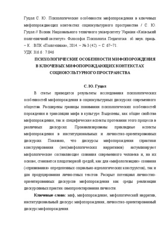 - Гуцол, С.Ю. (2014) Psychological features of myth origin in modern social and cultural discource Вісник Національного технічного університету України «Київський політехнічний інститут». Філософія. Психологія. Педагогіка: зб. наук. праць., 3 (42). pp. 67-71.