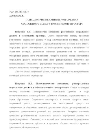 - Петренко, Ірина Володимірівна (orcid.org/0000-0002-5900-0852) (2014) Psychological mechanisms of deployment of social dialogue in the educational space Актуальні проблеми психології, 5 (14). pp. 170-176. ISSN 2072-4772