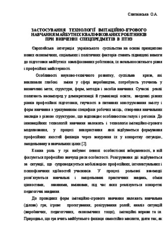 - Слатвінська, О.А. (2015) Use of simulation and gaming technology training of future skilled workers in the study of special subjects in vocational schools In: Науково-методичне забезпечення професійної освіти і навчання: матеріали Звітної науково-практичної конференції за 2014 рік (м. Київ, 26 березня 2015 р.) . Інститут професійно-технічної освіти НАПН України, м.Київ, Україна, pp. 135-137.