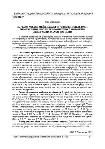 - Словінська, О.Д. (2015) Scientific organizational principles and factors of usefulness web conferencing systems аs the latest e-learning Теорія і практика управління соціальними системами, 3. ISSN 2078-7782