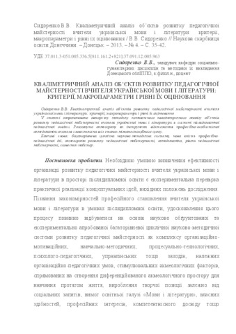 - Сидоренко, В.В. (2013) Qualimetric analysis objects pedagogical skills of teachers of Ukrainian language and literature, criteria and levels of macroparameters evaluation Наукова скарбниця освіти Донеччини, 4. pp. 35-42.