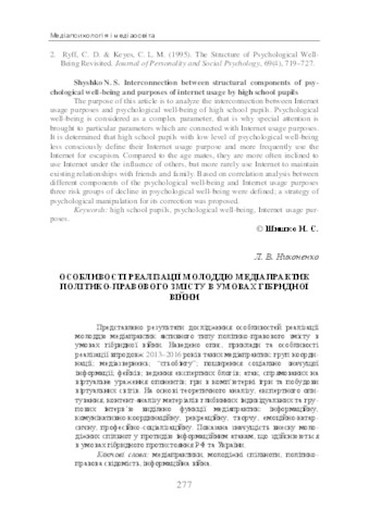 - Никоненко, Людмила Володимирівна (orcid.org/0000-0002-6770-0533) (2016) Implementation of political and legal media practices in terms of hybrid war Наукові студії із соціальної та політичної психології, 37 (40). pp. 277-289. ISSN 2309-8287