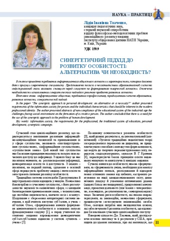- Ткаченко, Л.І. (2013) Synergetic approach to personal development: alternative or necessity? Education and Development of Gifted personality, 5 (12). pp. 11-13. ISSN 2309 ‑3935