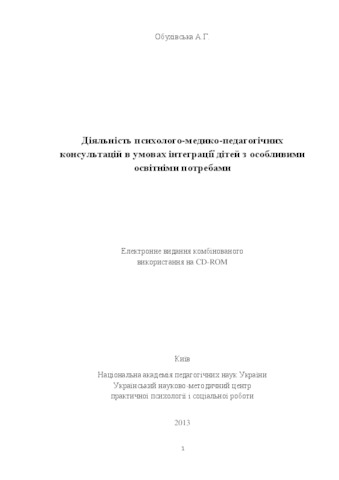 Обухівська, Антоніна Григорівна (2013) The activity of psycho-medical-pedagogical counseling in the integration of children with special educational needs . Український НМЦ практичної психології і соціальної роботи, м. Київ, Україна. ISBN 978-617-7118-06-9