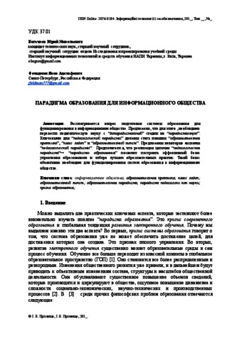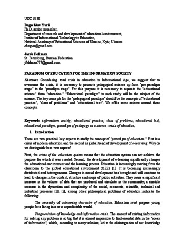 - Богачков, Ю.М. and Фельдман, Я.А. (2015) Paradigm of education for the information society Інфомаційні технології і засоби навчання, 5 (49). pp. 1-15. ISSN 2076-8184