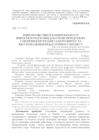 - Сидоренко, В.В. (2009) The levels of professional competence of teacher of initial classes as pre-condition of creation of the program of samorozvitku and perfection of pedagogical process. Гуманізація навчально-виховного процесу: матеріали Всеукр. наук.-практ. конф. «Сучасний стан та тенденції розвитку початкової освіти в Україні», 21-22 травня 2009 року, 45. pp. 106-110.