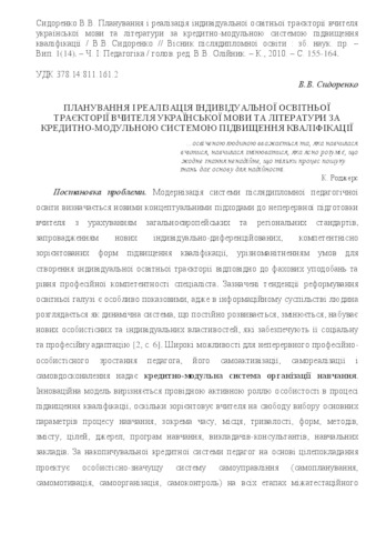 - Сидоренко, В.В. (2010) Planning and implementation of individual educational trajectory of the teacher of Ukrainian language and literature on credit-modular system of training Вісник післядипломної освіти. – Ч. І: Педагогіка, 1 (14). pp. 155-164.