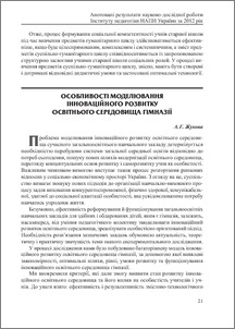 - Жукова, Алла Георгіївна (2013) Modeling of features innovative educational environment of high school In: Анотовані результати науково-дослідної роботи Інституту педагогіки за 2012 рік . Інститут педагогіки НАПН України, м.Київ, Україна, pp. 21-22.