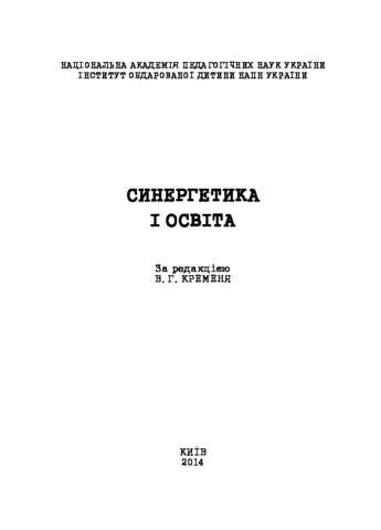 The monograph deals with modern educational, socio-cultural processes as an integrated, dynamic self-organizing system capable of permanent transformation and renewal.It is investigated that in the light of synergy education system appears as a possibility and reality of formation of creative, highly intelligent person, able to navigate in large flows of information exist in open complex system of human relationships and society.