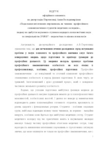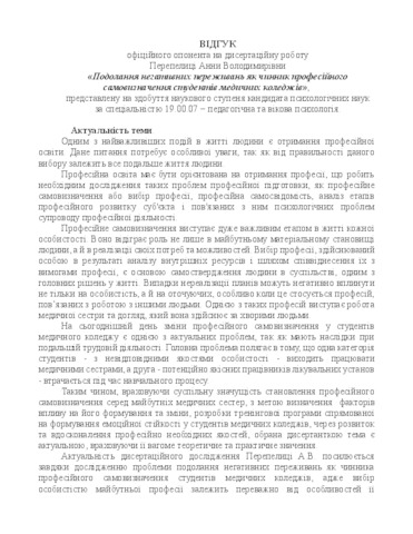 The dissertation features studying of peculiarities and prerequisites of professional self-determination of future nurses. It is theoretically grounded the professional self-determination of students of nurse profile and also determined factors influencing its development and changes among which are: age peculiarities and personal professional qualities, abilities. The attention is focused on negative emotions which take place in practical training of future nurse and can lead to the formation of emotional burnout, which we consider as manufactured by personality psychological defense mechanism in response to stressful situations. It was developed the model of professional self-determination of medical college’s student, which allows an integrated approach to the study of psychological characteristics of professional development, helps to differentiate students by level of professional self-determination (depending on the professional plans, motives and activities on the stage of choice of profession) and available professionally necessary personal qualities, and to determine the specific changes as a result of negative emotions while obtaining practical skills in the hospital. It was developed and tested training program “Prevention and overcoming of negative emotions during the practical activities of medical college’s students.” According to the tasks of research, forming influences were directed on development of personal qualities needed in the practical skills implementation in the presence of stress factors; on the analysis of professional situations which can cause negative emotions, and on studying methods of prevention of emotional burnout. Experience of trainings showed their effectiveness and certified the need for their implementation in practice of training of students of medical college. The results of forming experiment confirmed the assumption that the process of changes in professional self-determination because of negative emotions can effectively influenced within the educational process in college. That assumption was witnessed with differences of figures of personal professional qualities which in experimental group were higher than in control one. The results in terms of emotional stability indicate positive forming influence, due to lower rates of anxiety and emotional burnout in the first group than in the second. Also changes in professional plans indicate the loss of a significant number of personal among the students in the control group, while in the experimental group the given trend was almost not existed. During the implementation of the tasks it was received sufficient amount of theoretical and empirical information that verifies the hypothesis that changes in professional self-determination with the rejection of nurse profession occur as a result of the student’s experience of negative emotions during the execution of practical skills in hospitals and depend on personal professional necessary qualities required to work in stressful situations. The dissertation research does not cover all aspects of problem of medical college’s student personality formation. The prospects for further analysis are in deeper studying of adaptation to training of students at the eleven classes basis, improving practical approaches for the formation of emotional stability when dealing with stress factors and analyzing the need for professional selection to health educational institution.