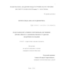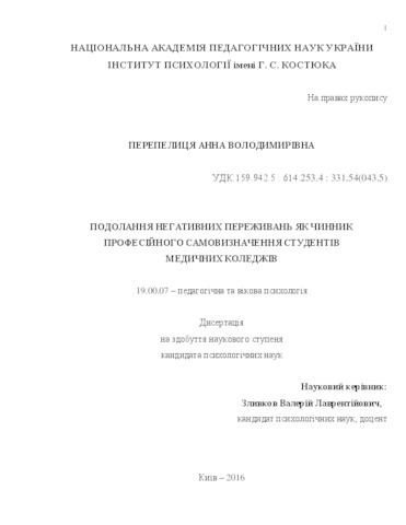 - Перепелиця, А. В. (2016) Overcoming negative emotions as a factor of professional self-determination of students of medical college Dissertation candidate thesis, Інститут психології імені Г. С. Костюка.