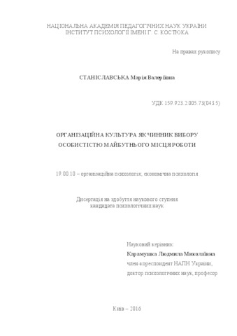 - Станіславська, М. В. (2016) Organizational culture as a factor in an individual’s choice of a future workplace Dissertation candidate thesis, Інститут психології імені Г. С. Костюка.