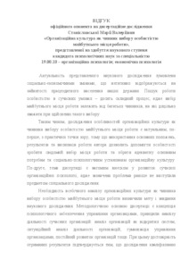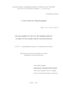 The dissertation explores the vital problem of an individual’s choice of an organizational culture in the future workplace. The work expounds theoretical and methodological support for and the results of the empirical research on the problem in question. In the work, the notion of «organizational culture», its content and structure have been analyzed. Personality as the subject of the choice of an organizational culture of the future workplace has been examined. On the basis of the empirical research, psychological features of an organizational culture in the future workplace have been determined. The impact of socio-demographic factors on the individual’s choice of an organizational culture in the future workplace has been observed. The connections between individual characteristics and indicators of organizational culture have been scrutinized. Psychological features of the individual’s choice of the dominant type of organizational culture in the future workplace based on the author’s typology have been analyzed. A model of individual psychological consulting of a person as the subject of the choice of an organizational culture in the future workplace has been developed and presented. Certain characteristic features of the process of individual psychological consulting have been demonstrated and its effectiveness has been explored.