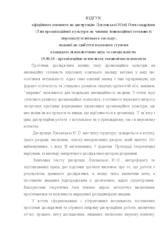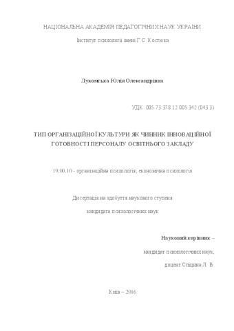 - Лукомська, Ю. О. (2016) Type Of Organizational Culture As a Factor Of Innovative Readiness Of Personnel Of Educational Establishment Dissertation candidate thesis, Запорізький національний університет.