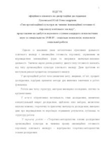 The dissertation deals with the problem of the types of organizational culture and their impact on innovative readiness of personnel of educational establishment. The research contains the theoretical background, methodology and the results of the empirical study of the problem. The author reveals the essence of organizational culture and the basic approaches to its study. The features of the organizational culture’s types of educational establishment are identified. The author analyzes definitions of innovations and factors of innovative readiness of personnel of the educational establishment. The author provided the model of innovative readiness of personnel of educational establishment. The empirical investigation determined the levels of development of innovative readiness of personnel of educational establishment with different types of organizational culture. The hypothesis of investigation of correlation between organizational culture’s types and innovative readiness of personnel of educational establishment has been proved. The author develops a special training program to increase innovative readiness of personnel of educational establishment on the basis of the formation of innovative values and norms of organizational culture and presents the results of its implementation. The testing of the training program showed its efficiency and compliance with tasks.