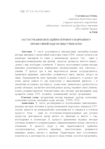 - Слатвінська, О.А. (2015) Using simulation and gaming training of students in vocational schools Теорія і методика професійної освіти, 6. pp. 1-10.