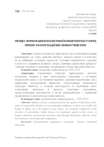 - Слатвінська, О.А. (2015) The process of formation ecological competence in the light of greening the thinking of students of vocational school Теорія і методика професійної освіти, 7. pp. 1-12.