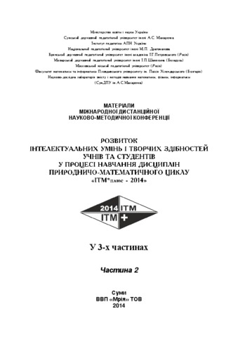 - Семеріков, С.О. and Єчкало, Ю.В. (2014) The development of intellectual abilities of students in teaching physics In: Розвиток інтелектуальних умінь і творчих здібностей учнів та студентів у процесі навчання дисциплін природничо - математичного циклу «ІТМ*плюс - 2014»: матеріали Міжнародної дистанційної науково - методичної конференції (20 - 21 березня 2014 р., м. Суми) , 2 . Мрія, м.Суми, Україна. ISBN 978–966–473–103–1