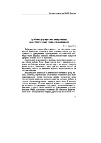- Осадчук, Раїса Іванівна (2012) Problem formation of differentiation of independent work of pupils of basic school In: Анотовані результати науково-дослідної роботи Інституту педагогіки за 2011 рік , 1 . Інститут педагогіки НАПН України, м. Київ, Україна, pp. 29-30.