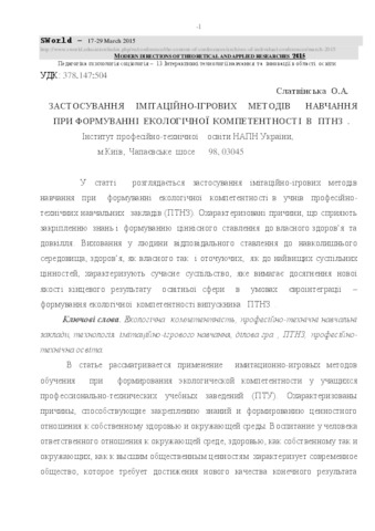 - Слатвінська, О.А. (2015) Simulation technology and game-based teaching in the formation of environmental competence in vocational schools Сучасні напрями теоретичних та прикладних досліджень: педагогіка, психологія і соціологія, 1 (38) (11). pp. 76-81. ISSN 2234-0187
