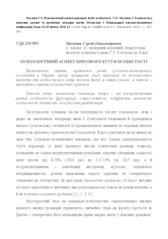 - Мусатов, Сергій Олександрович (2016) The psychological aspect of individual life crisis In: Особистість у кризових умовах та критичних ситуаціях . СумДПУ імені А.С. Макаренка, м. Суми, Україна, pp. 357-360. ISBN 978-966-698-211-6