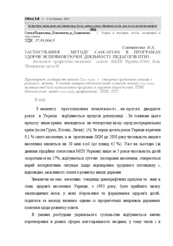 - Слатвінська, О.А. (2013) Case - Study method in health promotion of vocational schools teacher's programmes Наукові дослідження та їх практичне застосування. Сучасний стан та шляхи розвитку, 3 (17). pp. 24-30. ISSN 2224-0187